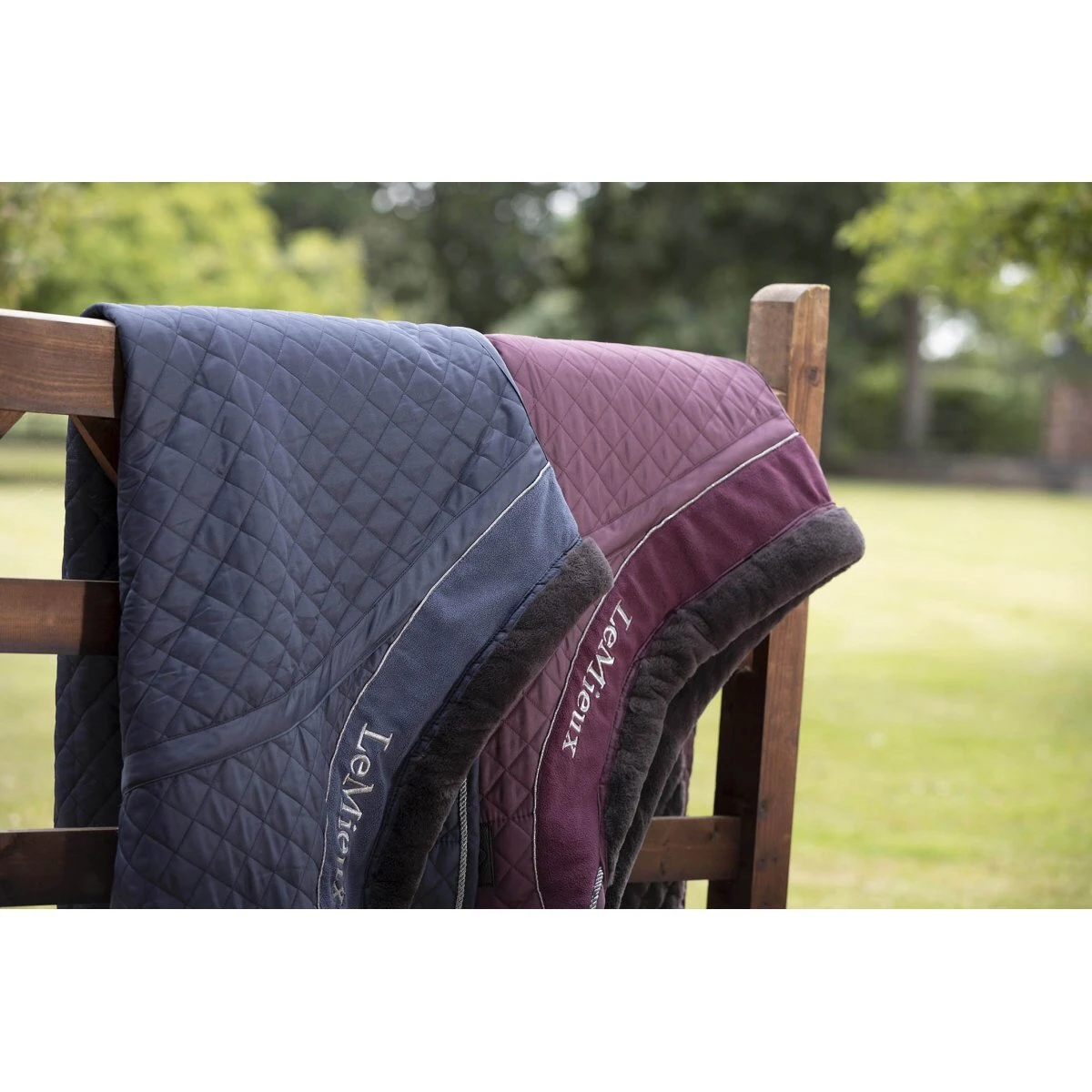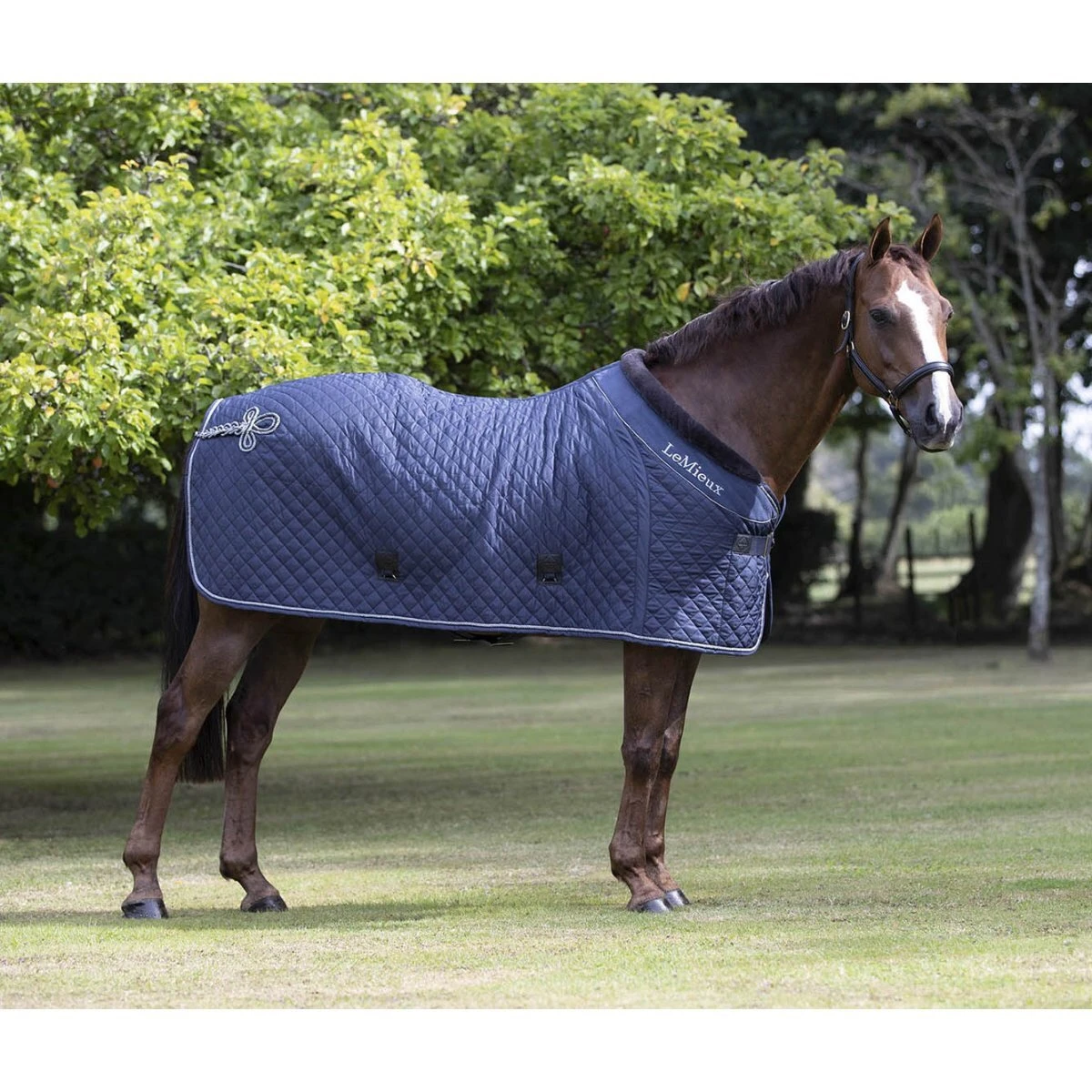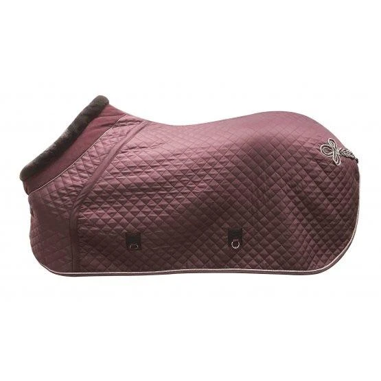 Smart show rug that has it all. Beautiful quilting is off-set by a luxurious fleece collar. Twin belly straps can be secured inside or outside of the rug and are detachable at both ends makes it ideal for throw-over at shows or travel
