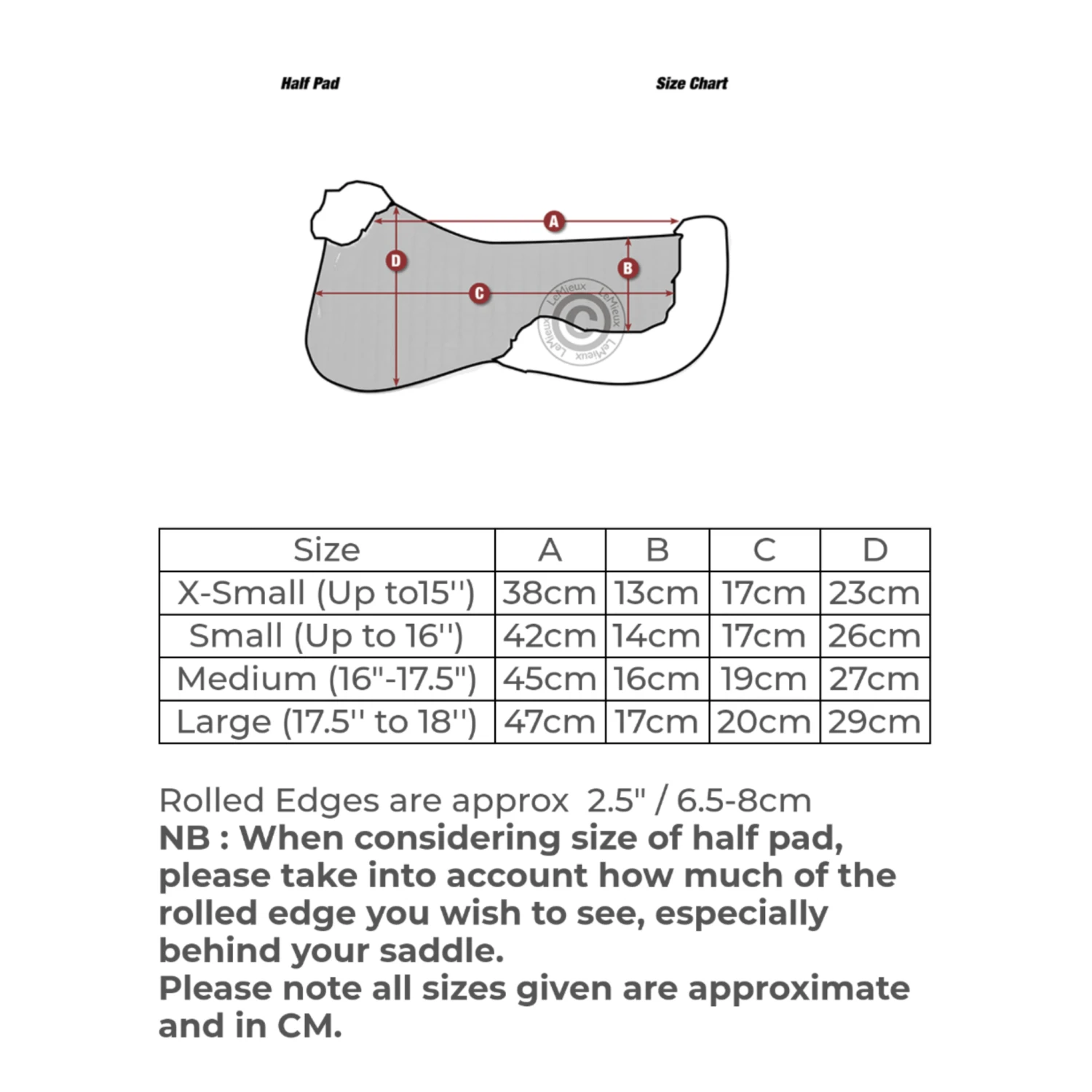 NB : When considering size of half pad, please take into account how much of the rolled edge you wish to see, especially behind your saddle.