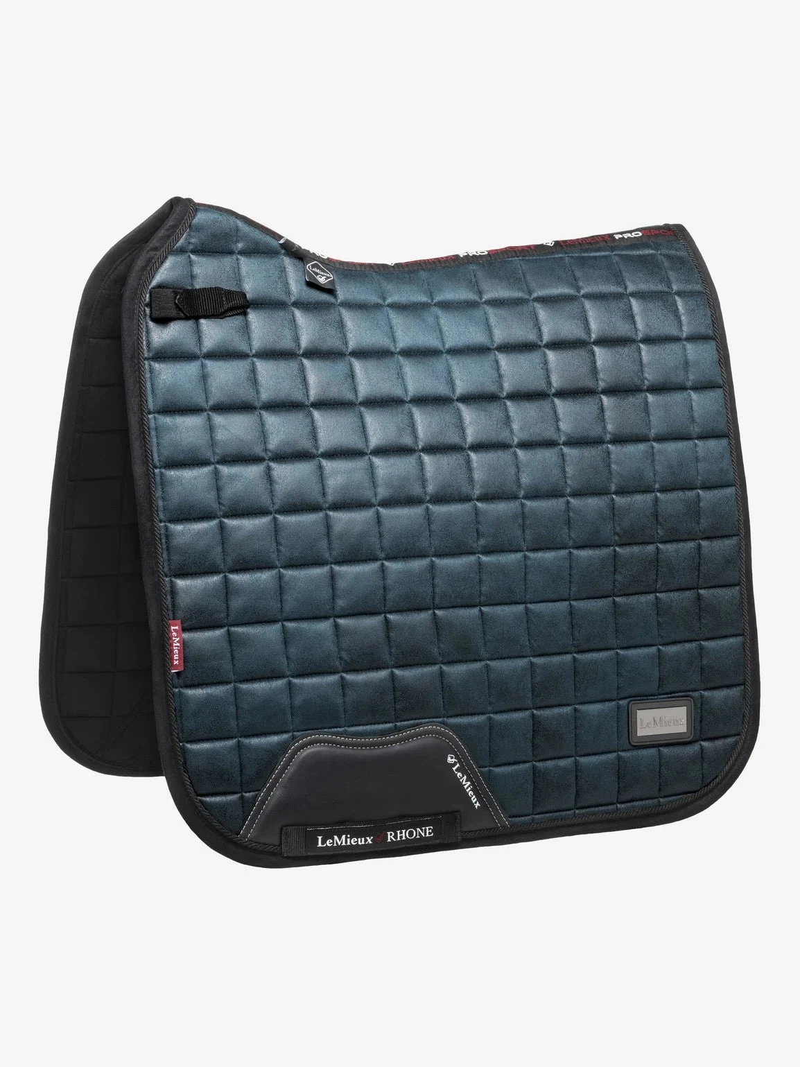 The signature PU leather girth protection area is complimented by an embossed logo and carries the usual signature LeMieux lower girth strap with its inner locking loops, and the D-Ring tabs hold the pad securely to the saddle