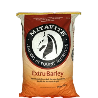 Mitavite Extru® Grains provide effective, safe feed-room options. Mitavite Extru® Barley is an excellent source of energy and fibre, making it a popular ingredient in horse rations. When fed raw barley is poorly digested in a horse’s small intestine. Rolling or steam-flaking improves digestibility a little, roasting significantly. Steam extrusion has the greatest effect, increasing digestibility to over 90% in the small intestine