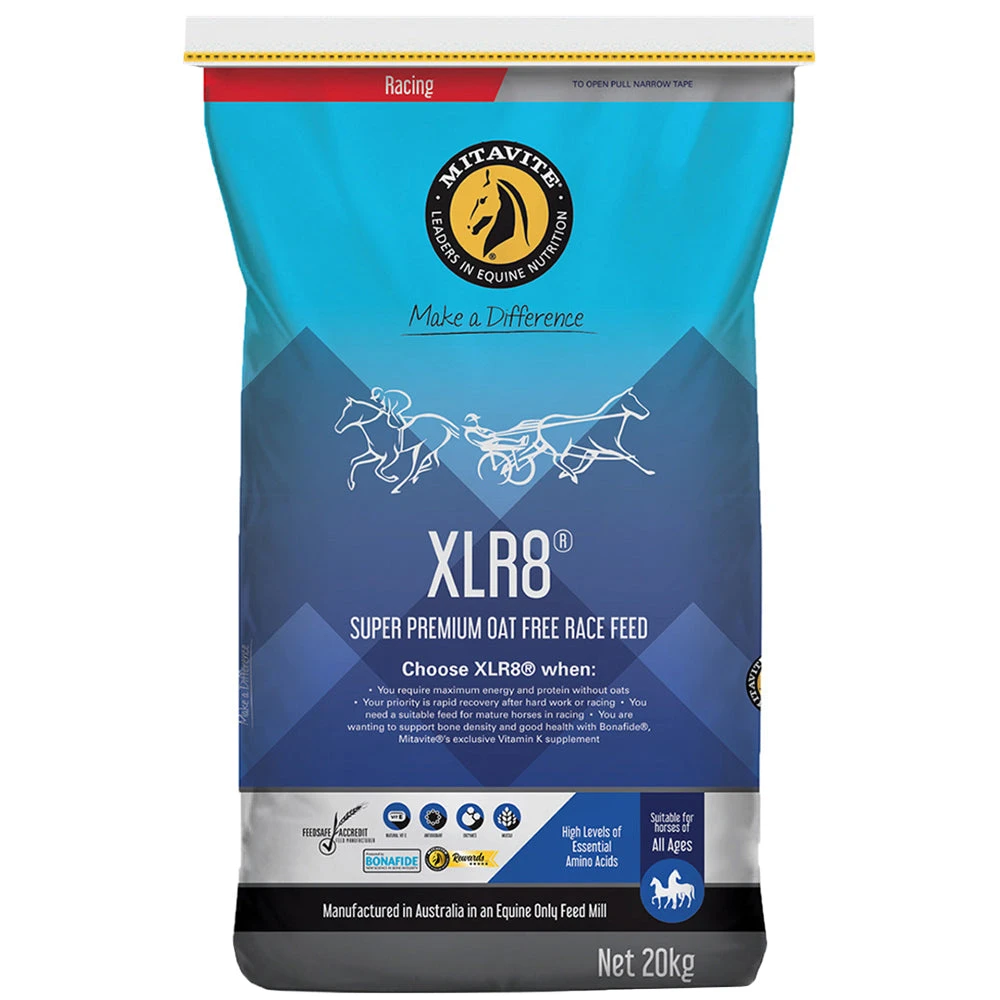 Mitavite® XLR8® is an oat free, energy dense, muesli style complete feed incorporating the benefits of steam extrusion for fast acting energy. Formulated for the racing thoroughbred and standardbred, XLR8® provides high levels of Essential Amino Acids in a horse specific profile to assist with muscle function and recovery after strenuous work.