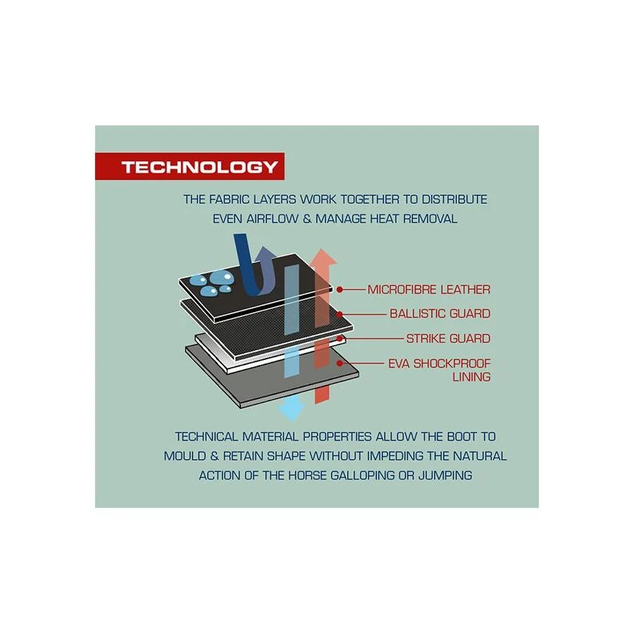 Our high-cut design provides maximum coverage and protection from knocks and scrapes. A strike guard runs along the front of the boot protecting the leg from impact with fences. 8 air vents allow a constant stream of air to pass through the boots whilst the horse is in action.