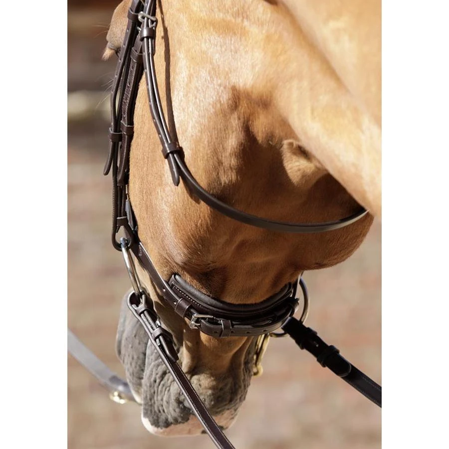 Constructed using high quality Italian leather this anatomic bridle has been carefully shaped to contour around the horse’s ears, nose and cheekbones in order to achieve a more comfortable and ergonomic fit. The anatomically shaped, padded poll piece is designed to distribute pressure over the less sensitive areas of the poll and away from the ears. The Browband is also shaped to create definition and features a round raised design alongside soft padding.